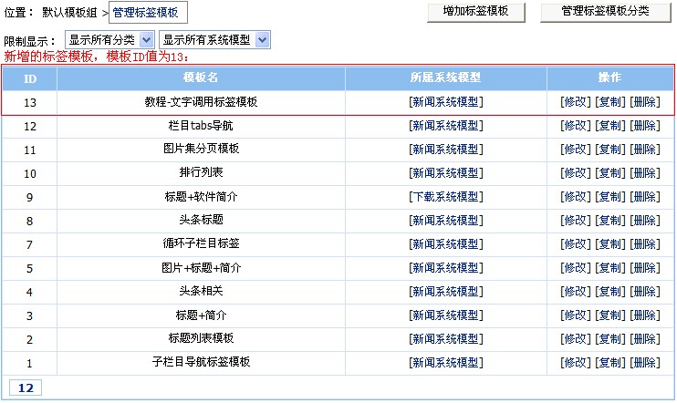 確定"標簽?zāi)0錓D"值:標簽?zāi)0逶黾油戤吅?返回"管理標簽?zāi)0?quot;頁面,得到由CMS系統(tǒng)自動分配、新增加的標簽?zāi)0錓D值. |