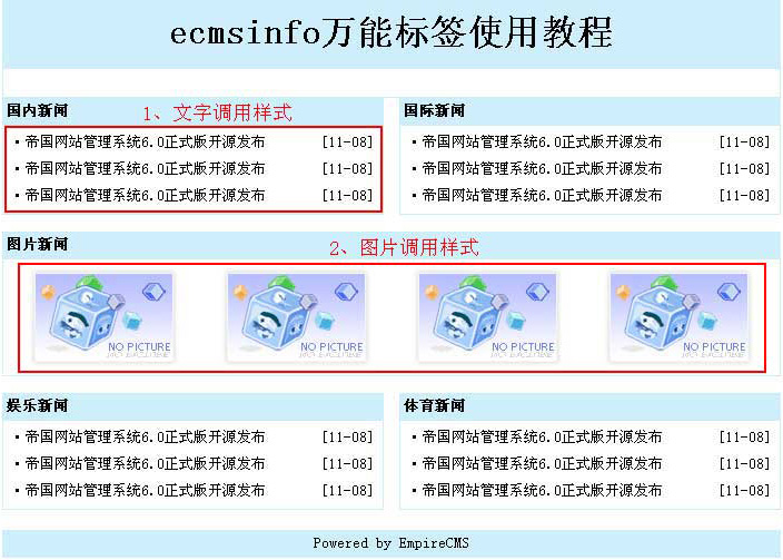 | ecmsinfo標簽與其它信息調(diào)用標簽唯一不同的是:顯示樣式由標簽?zāi)0鍥Q定。 |