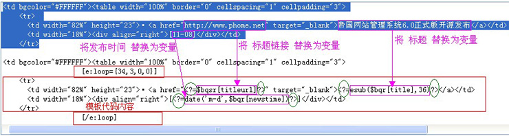 | 在模板代碼中,找出與其他信息不同之處并用變量替換,如標(biāo)題,標(biāo)題鏈接,發(fā)布日期: |