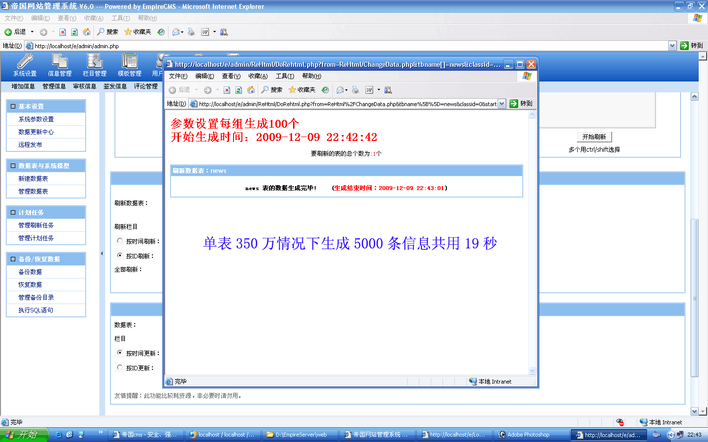 ![]() 生成過程截圖: ![]() 5000條生成時(shí)間:19秒 生成后的欄目目錄:(又差點(diǎn)忘了截圖-_-!) |