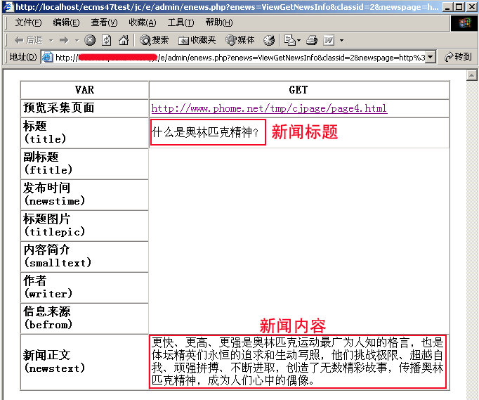 | (2)、內容正則:由源代碼內容我們得出“新聞內容”正則為: |