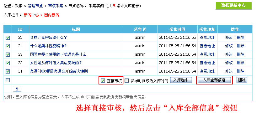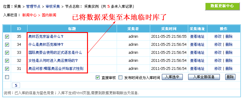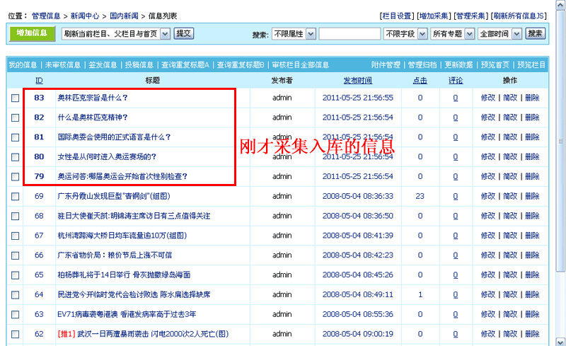 管理欄目信息也可以看到我們剛才入庫的信息: