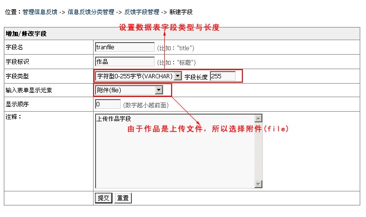 登陸后臺->"插件管理"->"管理反饋?zhàn)侄?quot;->"新建字段",進(jìn)入如下界面: