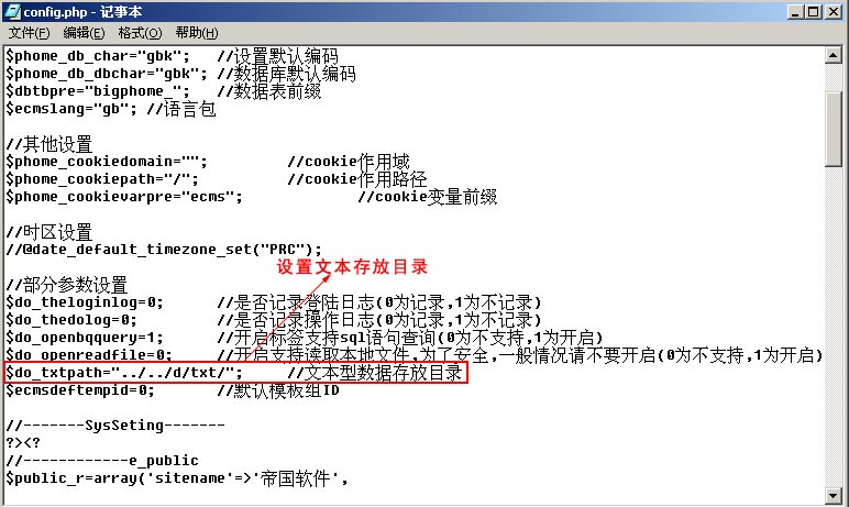 存放目錄可自定義:你可以設(shè)置文本數(shù)據(jù)存放到哪個目錄,包括WEB訪問不到的地方。設(shè)置只需改e/class/config.php的參數(shù)即可,如圖: