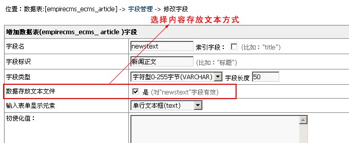 首先,你的字段名要為newstext;然后增加字段時選擇“數(shù)據(jù)存放文本文件”選項即可,如下圖: