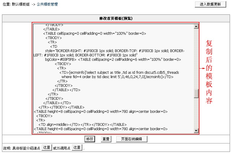 4、現(xiàn)在我們修改首頁(yè)模板: 登陸后臺(tái)->"模板管理"->"公共模板"->"修改首頁(yè)模板",將模板內(nèi)容復(fù)制到dreamweaver編輯,在模板中加入調(diào)用論壇貼子的標(biāo)簽,如下圖: (說(shuō)明:其中“where fid=版塊ID”為按論壇版塊調(diào)用貼子。) 圖1:(在dreamweaver中的首頁(yè)模板)