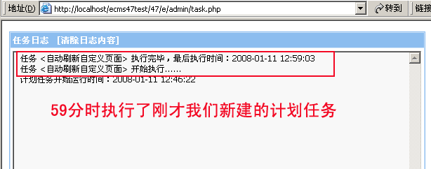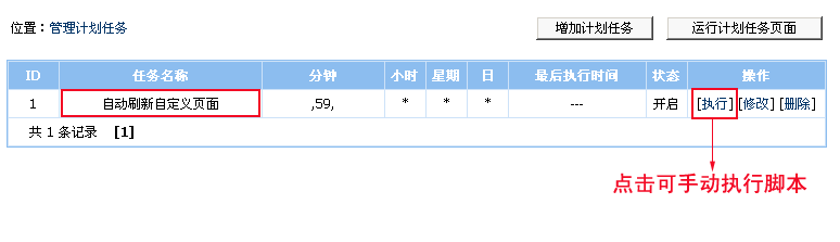 任務(wù)名稱:自動(dòng)刷新自定義頁(yè)面 執(zhí)行腳本設(shè)為:reuserpage_task.php 說(shuō)明:上面例子我把執(zhí)行時(shí)間設(shè)為每個(gè)小時(shí)的59分鐘時(shí)執(zhí)行。