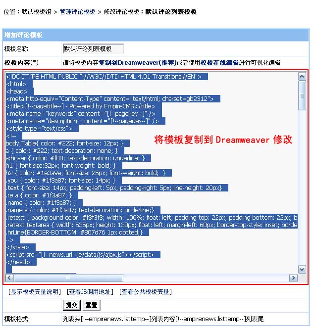 (1)、后臺>"模板管理">"管理評論模板">修改,進入評論模板修改界面: