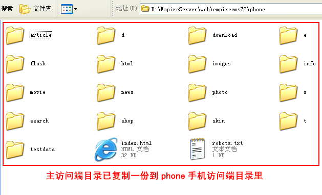 一般在主訪問(wèn)端下建個(gè)子目錄就可以。比如:在帝國(guó)CMS根目錄下建“phone”目錄來(lái)做手機(jī)訪問(wèn)端目錄。