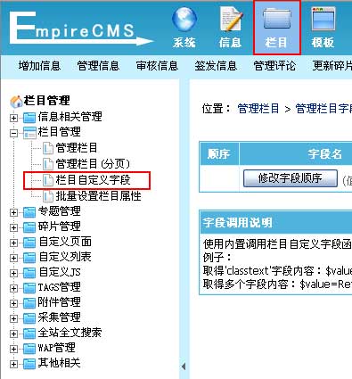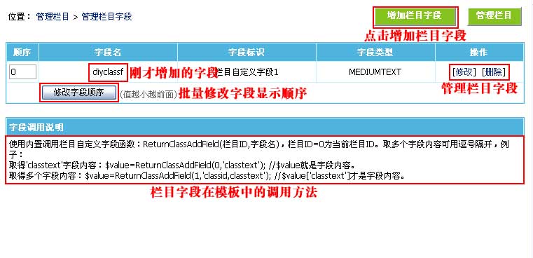 1、增加欄目字段后,返回管理欄目字段界面,就可以看到我們增加的字段: