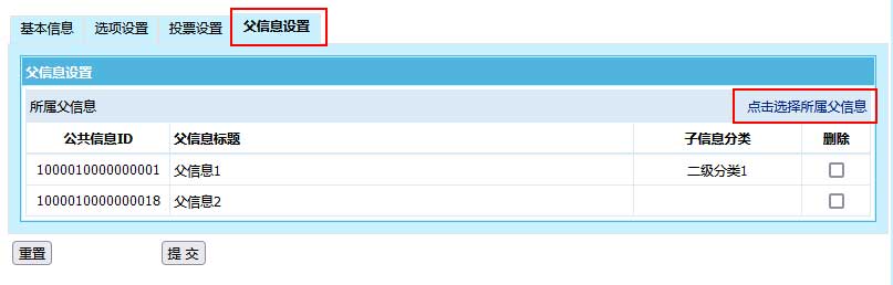 2、增加父信息后,增加信息時(shí)就會(huì)有選擇父信息選項(xiàng)設(shè)置,可以選擇多個(gè)父信息及子信息分類: