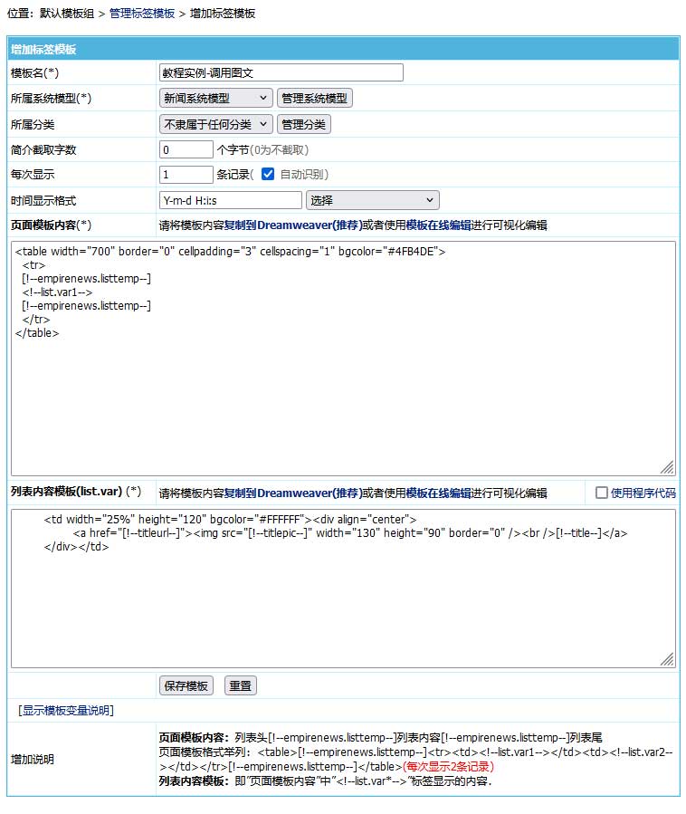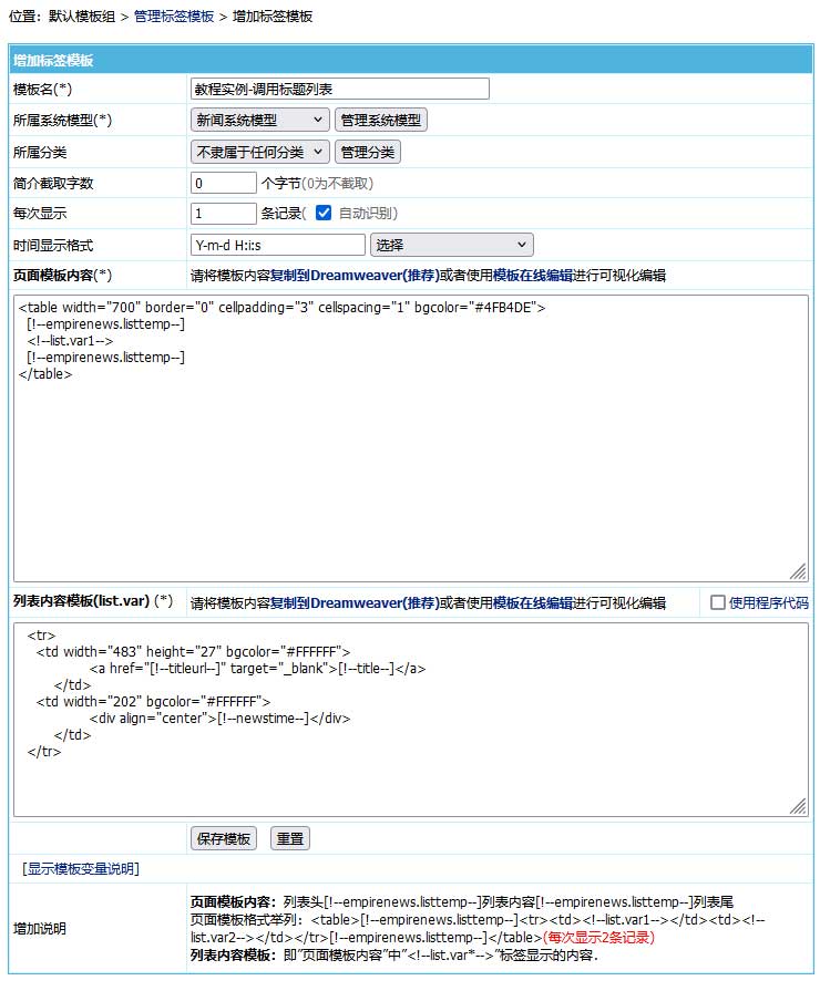 根據(jù)上面HTML網(wǎng)頁(yè)代碼可增加如下標(biāo)簽?zāi)0澹?/strong>(后臺(tái)>模板>標(biāo)簽?zāi)0?gt;管理標(biāo)簽?zāi)0?gt;增加標(biāo)簽?zāi)0? 標(biāo)簽?zāi)0宓?ldquo;頁(yè)面模板內(nèi)容”為如下: