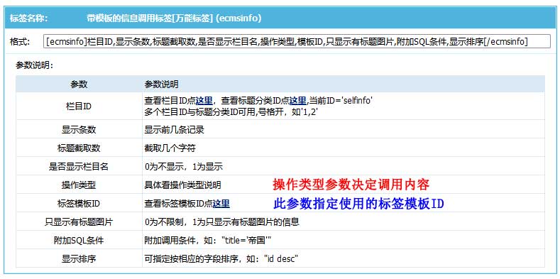 (第5個(gè)“操作類型”參數(shù)決定調(diào)用內(nèi)容、以及決定第1個(gè)“欄目ID”參數(shù)內(nèi)容。) (新手還可以用“后臺(tái)>模板>自動(dòng)生成標(biāo)簽”來生成調(diào)用標(biāo)簽。)