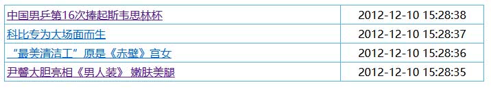<table width="700" border="0" cellpadding="3" cellspacing="1" bgcolor="#4FB4DE"> <tr> <td width="483" height="27" bgcolor="#FFFFFF"> <a href="信息鏈接1" target="_blank">信息標(biāo)題1</a> </td> <td width="202" bgcolor="#FFFFFF"> <div align="center">2026-01-01 09:08:07</div> </td> </tr> <tr> <td height="27" bgcolor="#FFFFFF"> <a href="信息鏈接2" target="_blank">信息標(biāo)題2</a> </td> <td bgcolor="#FFFFFF"> <div align="center">2026-01-01 09:08:07</div> </td> </tr> <tr> <td height="27" bgcolor="#FFFFFF"> <a href="信息鏈接3" target="_blank">信息標(biāo)題3</a> </td> <td bgcolor="#FFFFFF"> <div align="center">2026-01-01 09:08:07</div> </td> </tr> <tr> <td height="27" bgcolor="#FFFFFF"> <a href="信息鏈接4" target="_blank">信息標(biāo)題4</a> </td> <td bgcolor="#FFFFFF"> <div align="center">2026-01-01 09:08:07</div> </td> </tr> </table> |