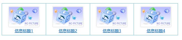 <table width="700" border="0" cellpadding="3" cellspacing="1" bgcolor="#4FB4DE"> <tr> <td width="25%" height="120" bgcolor="#FFFFFF"><div align="center"> <a href="信息鏈接1"><img src="img/notimg.gif" width="130" height="90" border="0" /><br />信息標(biāo)題1</a> </div></td> <td width="25%" height="120" bgcolor="#FFFFFF"><div align="center"> <a href="信息鏈接2"><img src="img/notimg.gif" width="130" height="90" border="0" /><br />信息標(biāo)題2</a> </div></td> <td width="25%" height="120" bgcolor="#FFFFFF"><div align="center"> <a href="信息鏈接3"><img src="img/notimg.gif" width="130" height="90" border="0" /><br />信息標(biāo)題3</a> </div></td> <td width="25%" height="120" bgcolor="#FFFFFF"><div align="center"> <a href="信息鏈接4"><img src="img/notimg.gif" width="130" height="90" border="0" /><br />信息標(biāo)題4</a> </div></td> </tr> </table> |