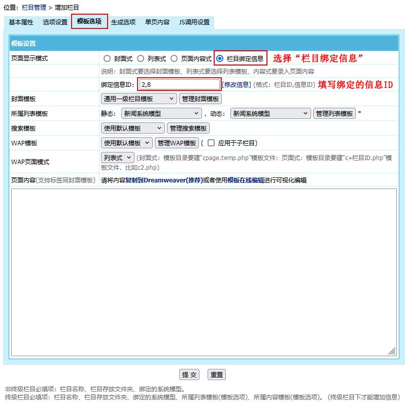 模板選項(xiàng)>“頁(yè)面顯示模式”選擇“欄目綁定信息”、“綁定信息ID”填寫(xiě)信息頁(yè)面的ID,格式為“欄目ID,信息ID”。