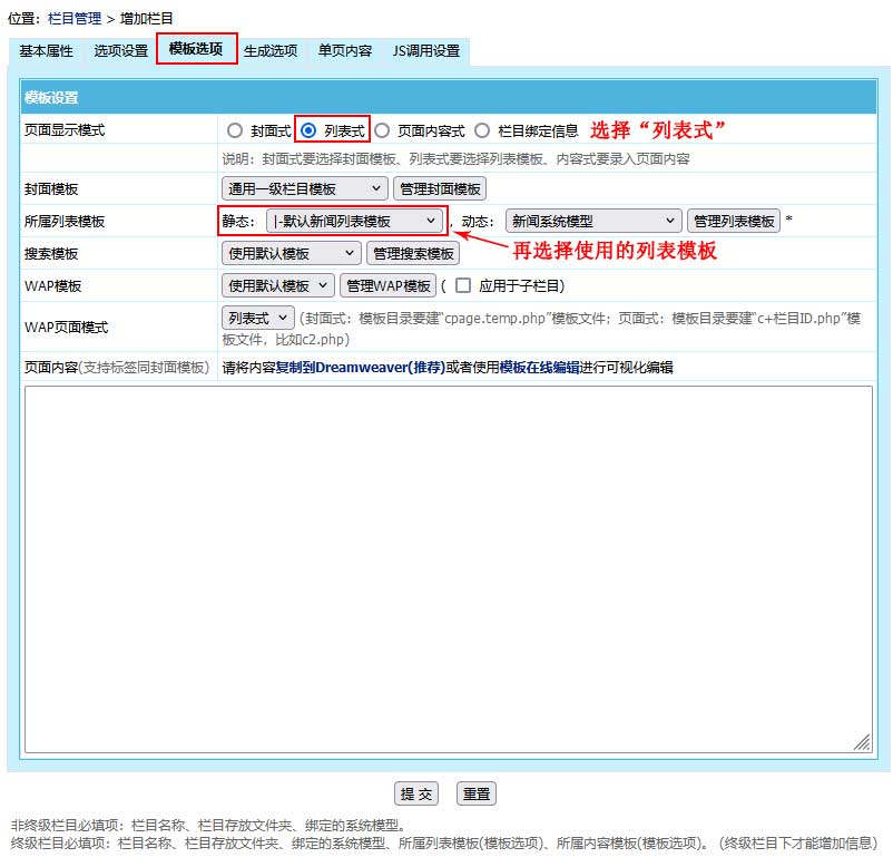 模板選項>“頁面顯示模式”選擇“列表式”、“所屬列表模板”選擇要使用的列表模板即可。