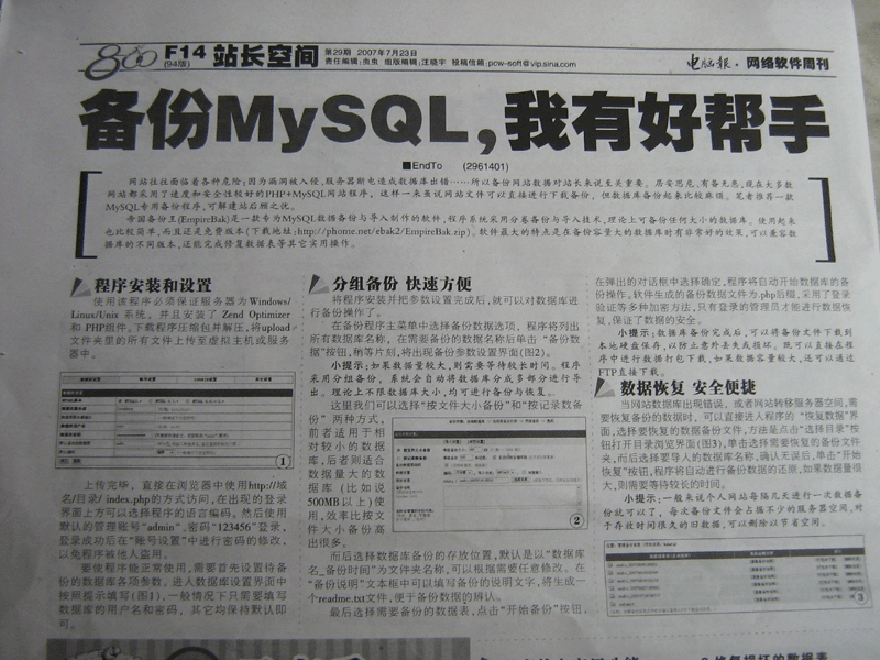 7月23日 《電腦報》第29期 F14版 以標(biāo)題為“備份Mysql,我有好幫手”對【帝國備份王】進行了整版報道。