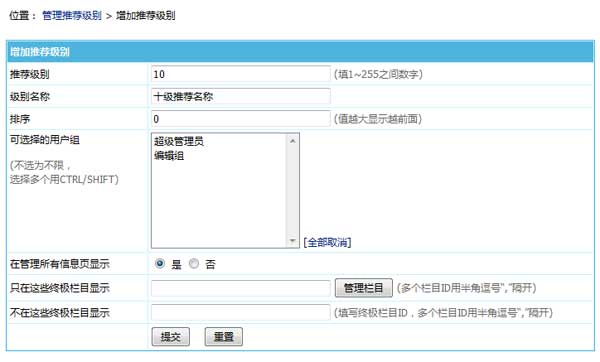 帝國CMS7.5的信息頭條和推薦各支持255級,更靈活