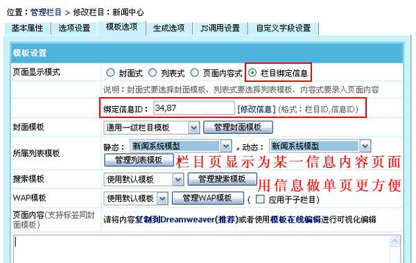 帝國(guó)CMS 6.6版新增欄目綁定信息功能,可以指定欄目的頁(yè)面內(nèi)容為綁定信息的頁(yè)面內(nèi)容。方便用發(fā)布信息做自定義頁(yè)面的用戶。