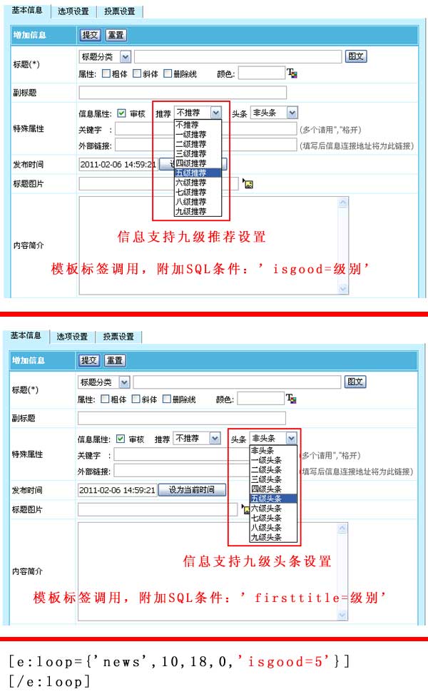 帝國CMS 6.6版信息支持九級推薦和九級頭條,調(diào)用更靈活,更多樣化。后臺支持設(shè)置多級,前臺支持按各級調(diào)用信息。