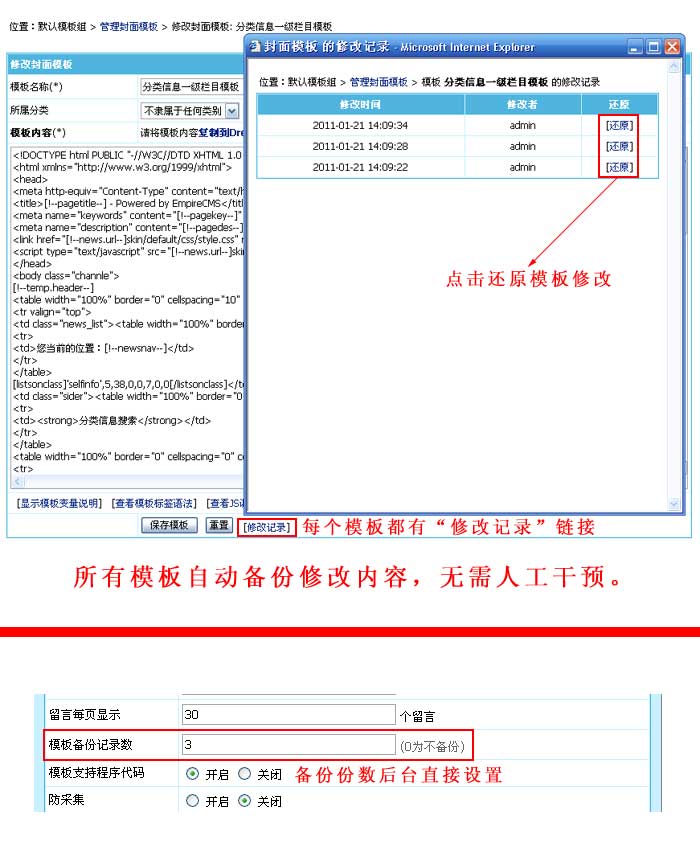 (1)、所有模板都支持自動(dòng)備份:包括標(biāo)簽?zāi)0?、JS模板、列表模板、內(nèi)容模板、搜索模板、模板變量、封面模板、首頁方案、自定義頁面模板、評論模板、打印模板、投票模板、所有公共模板等都支持模板自動(dòng)備份。