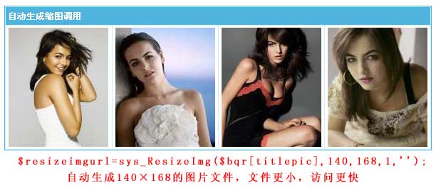 帝國CMS 6.6版模板新增自動生成縮圖函數,可直接將標題圖片轉成相應的尺寸顯示,文件更小,訪問速度更快。