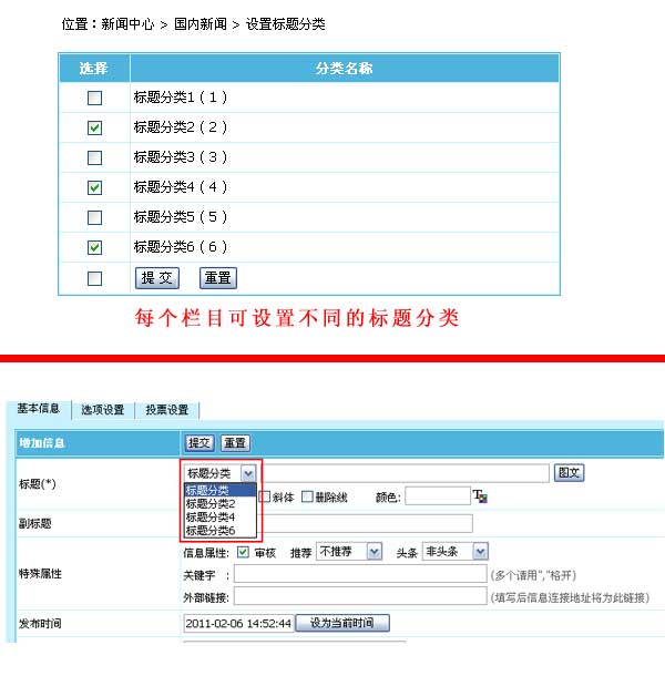 帝國CMS 6.6版各欄目支持設置不同的標題分類,更人性化。