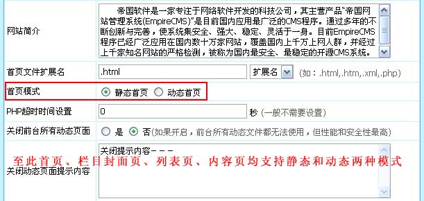 帝國CMS 6.6版首頁和欄目封面頁新增支持動(dòng)態(tài)、靜態(tài)兩種模式。至此首頁、欄目封面頁、列表頁、內(nèi)容頁均支持靜態(tài)和動(dòng)態(tài)兩種模式。